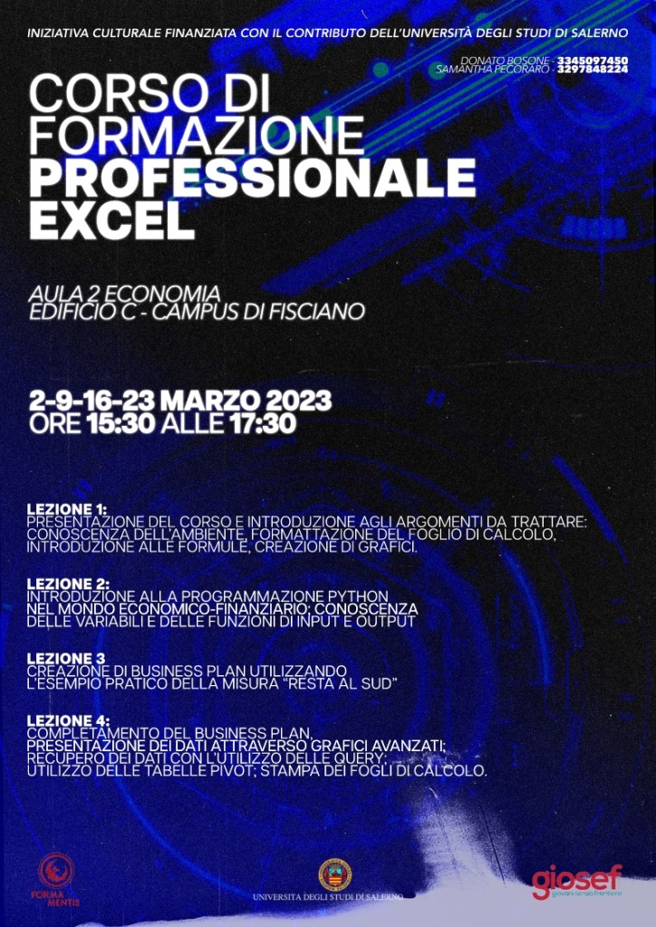 Il corso di Excel, tenutosi nei giorni 2-9-16-23 Marzo 2023, si propone di essere un corso di formazione professionale aperto a tutti gli studenti dell’ateneo al fine di migliorare le proprie skills sull’utilizzo di Microsoft Excel. Durante le lezioni sono stati toccati quattro aspetti fondamentali: